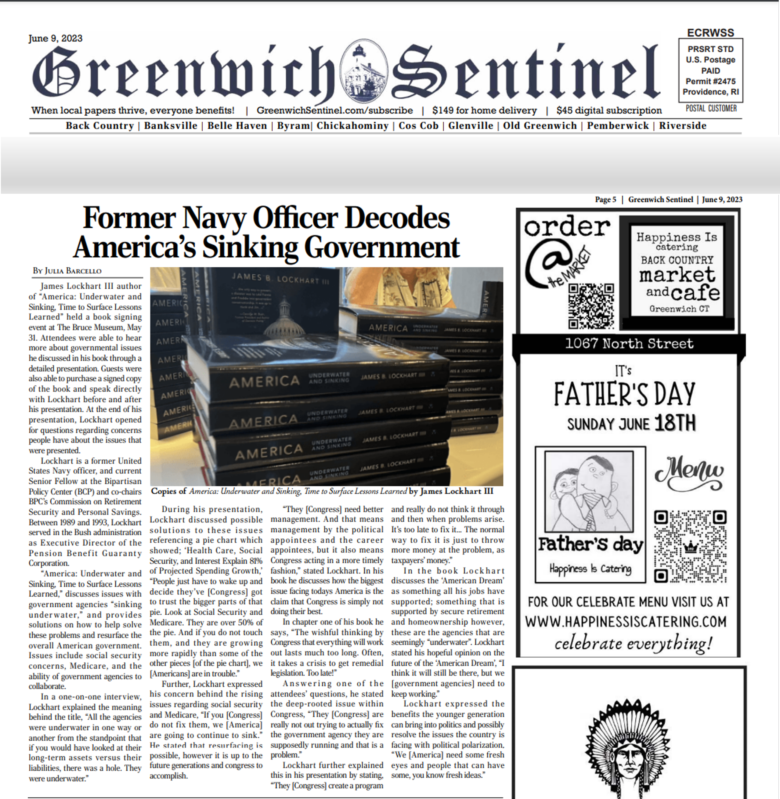 Greenwich Sentinel: Former Navy Officer Decodes America’s Sinking Government by Grace Djuranovic | Jun 9, 2023 | Articles | 0 comments Link: Greenwich Sentinel – June 9, 2023 Issue Submit a Comment Cancel replyYour email address will not be published. Required fields are marked *Comment * Name * Email * Website Save my name, email, and website in this browser for the next time I comment.